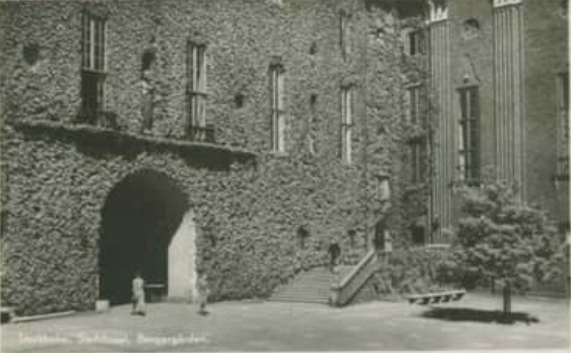 I fotografier från omkring 1930 ser vi henne, fortfarande ung, kanske fyra till fem meter hög, med en redan bred och välformad krona. Trädet står exakt där dagens träd står. Positionen stämmer med valvet, med trappan och med gårdens linjer.